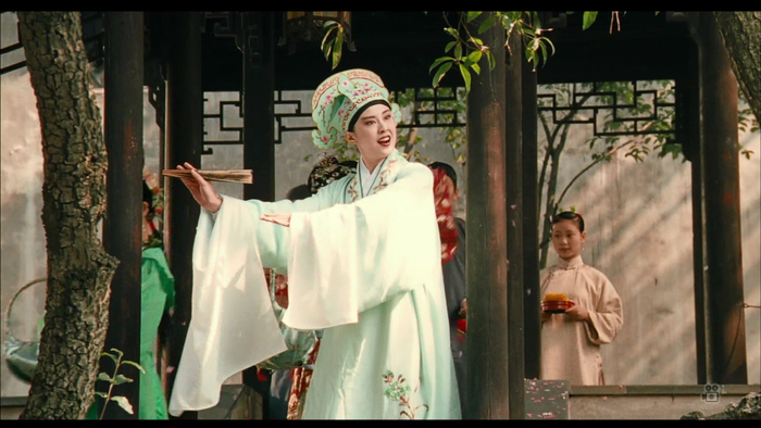《游园惊梦》正片开场,是小姐在丫鬟的见证下,与折柳的书生在后花园邂逅的实景表演。这段既出自《牡丹亭》又取材《西厢记》的情节(《牡丹亭》中没有丫鬟的在旁,《西厢记》中没有书生的捧柳),看似是常见于才子佳人戏文的俗套设计,实则功用多重。既为荣兰是跟随表哥荣老爷见到翠花,继而在《牡丹亭》经典唱段的助兴下,与她像柳梦梅和杜丽娘般一见钟情作出铺垫,又点出两人身处的小环境——荣老爷的苏州荣家大院,就像《红楼梦》里的金陵荣国府一样,奢华深处弥漫颓败的死亡气息。