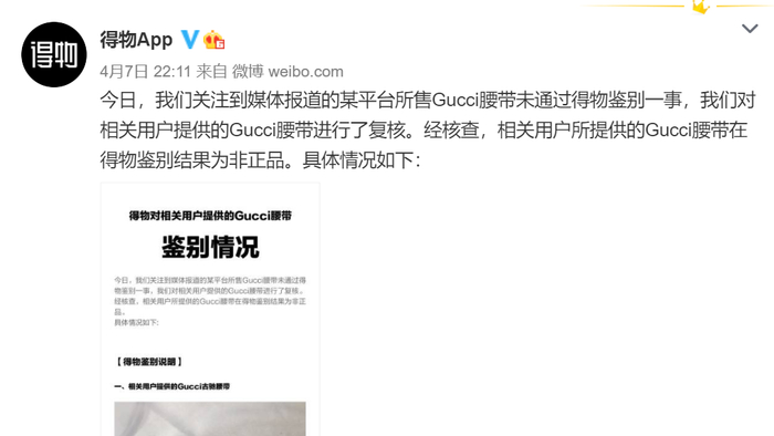 与此同时,得物也在微博上公布了自己的检测结果,有四家第三方鉴定平台分别对该款腰带进行检测,均鉴定该腰带为假货。