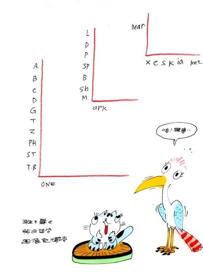 就像背单词,如果画个X轴、Y轴,分别写上不同的字母。比如,英文“ark”可以通过结合不同的首字母组成多个词:“一个lark去一个dark的park,借着spark在bark中间雕刻shark的mark。”就是“一只银雀去一个黑暗的公园借着星星之火在树皮上雕刻鲨鱼的商标。”这样你可以同时记7个单词,再通过画面加固记忆。