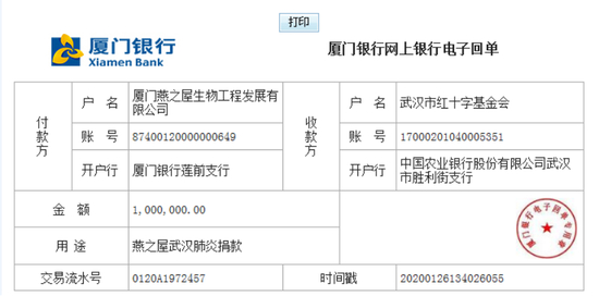 图:2020年1月26日,燕之屋向武汉疫情一线捐献首批100万元爱心资金