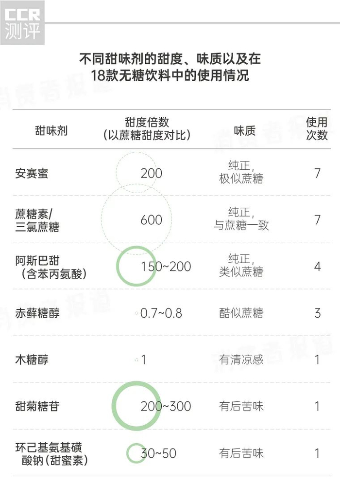 此前,《消费者报道》曾对电商平台上热销的18款无糖饮料的配料成分进行分析。结果发现,在无糖饮料中人工甜味剂的使用频率要高于天然甜味剂。