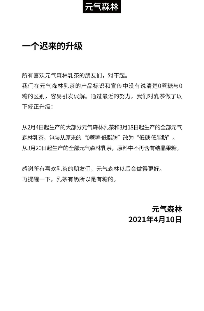 4月10日,国内饮料品牌元气森林发布致歉声明,声明中称在乳茶产品的产品标示和宣传中,没有说明“0蔗糖”与“0糖”的区别,容易引发误解。