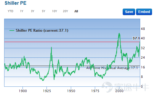 如果只看10年调整PE,也就是大家熟知的席勒PE,当前值为37.1,历史最高值为43.8。