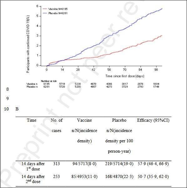 研究的终点是检验疫苗接种对有症状的保护力。在两组共253人发生有症状感染时,达到了中期分析要求。此时,在接种第二次疫苗14天的4953人队列中,有85例感染;而安慰剂队列4870中,有168人感染。首要目标分析显示疫苗保护力为50.7%。