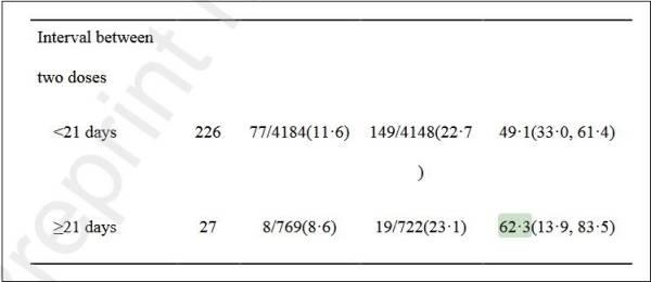 此外,报告还有几项令人鼓舞的发现。首先,本次试验中部分受试者注射间隔达到21天或以上,这部分人中疫苗有效率出现了提高的趋势。