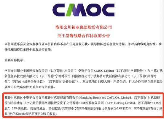 4月11日晚间,“钴业大佬”洛阳钼业发布公告,全资子公司洛钼控股与宁德时代间接控股公司邦普时代达成协议,邦普时代将通过香港全资子公司,以1.375亿美元从洛钼控股手中受让KFM控股25%股权,后者持有刚果(金)的Kisanfu铜钴矿项目95%权益;与此同时,双方还将在产品包销、新能源金属方面持续深化合作。