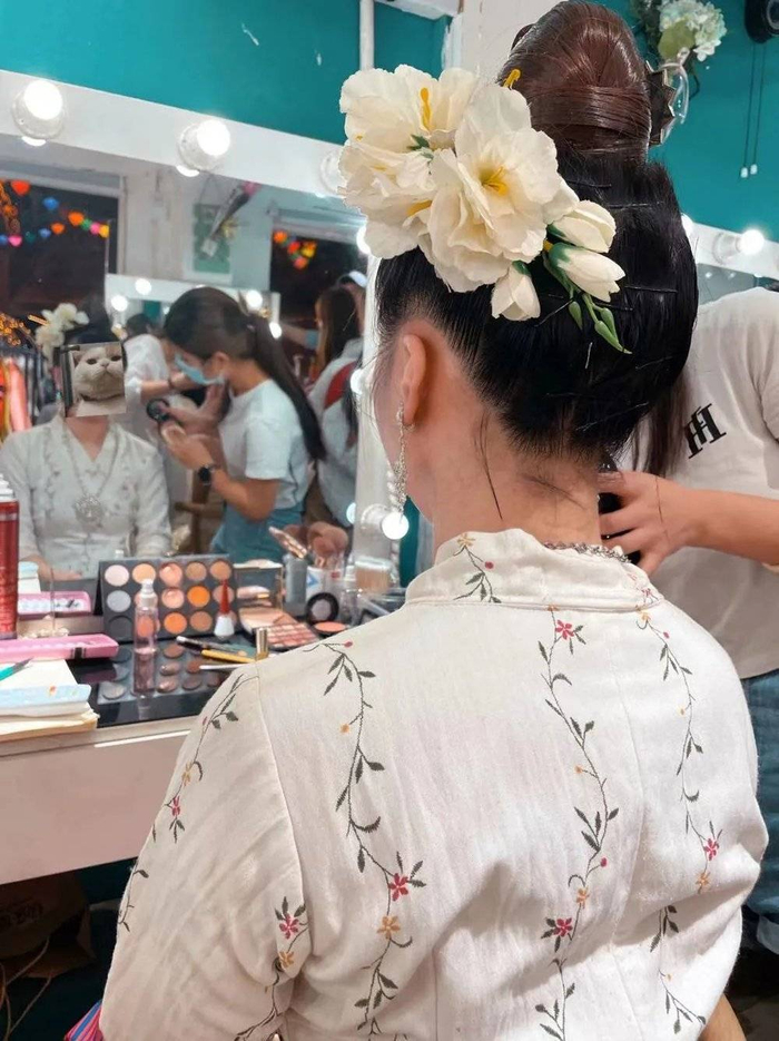 话音未落,化妆师已经动手在我头发上喷起了定型摩丝,随后把头发分成一缕一缕弯上头顶,用发圈环了3圈固定住,再变出了10来个黑色小发卡,别住垂在两旁的碎发。最后套上一只假发髻,在左侧别了一串绢花发饰。