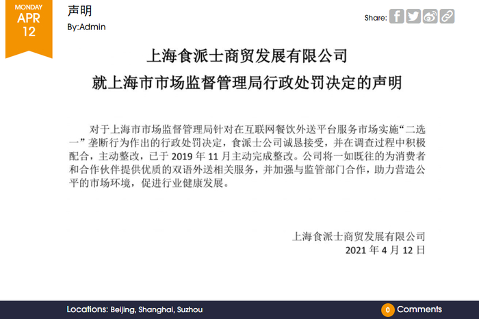 4月12日,上海市市场监管局宣布,2017年1月至2019年10月,食派士实施了没有正当理由限定交易的滥用市场支配地位行为,锁定了相关市场内大量合作餐厅商户资源,严重削弱了竞争对手的竞争能力,损害了平台内商户和消费者利益,具有明显的排除、限制竞争效果。