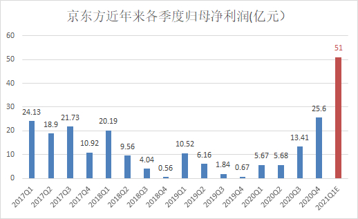 4月12日晚,京东方A发布一季度业绩预告,数据十分亮眼,预计2021年一季度归属于上市公司股东的净利润50亿元-52亿元,比上年同期增长782%-818%,一季度净利规模有望赶超2020年全年,也是公司20年来表现最好的单季度。