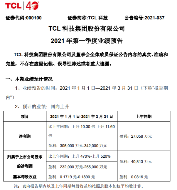 同日,另一显示龙头TCL科技也发布了一季度业绩预告,公司预计2021年第一季度实现归属于上市公司股东的净利润为23.2亿元-25.5亿元,同比上升470%-520%。