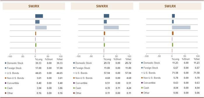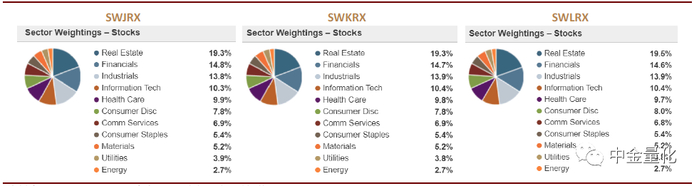 Schwab® Monthly Income Funds系列基金根据目标派息预期的不同分为三档:中等派息(SWJRS)、增强派息(SWKRX)和最大派息(SWLRX),固定收益资产投资比例越高,票息收入越高,基金的预期月度固定派息越高,但同时股票资产的投资比例则越低,最大派息基金股票资产投资上限仅为25%。从历史表现来看:随着股票投资比例上升,基金的年化收益也越高,截至2021年3月底,该系列基金中长期表现优异,5年平均年化收益分别可达到4.19%、5.27%和6.29%。从配置情况来看:月度派息系列三只基金虽然股债配置比例不同,但底层标的资产与股票资产行业分布几乎一致,底层资产主要投资于债券指数基金和高分红股票指数基金,房地产、金融、制造业投资比例占权益资产近50%。