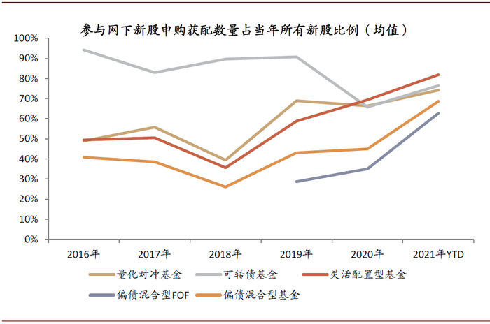 具体来看,一级债基主要通过配置一定比例的可转债实现收益增强;二级债基可同时配置可转债和二级市场股票,但这两类基金现阶段均已不可参与网下打新;偏债混合基金、灵活配置基金和量化对冲基金在资产的选择上则更加丰富和灵活;偏债混合型FOF是其中较为特殊的一类,不仅可以配置可加类别的资产,还可以通过基金配置海外资产、商品等。
