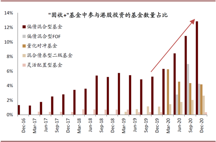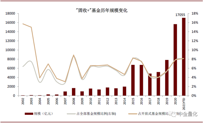 图表:“固收+”基金规模爆发式增长,占公募基金比例亦同步提升