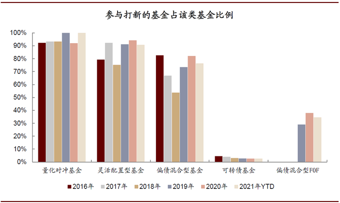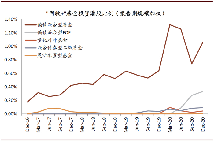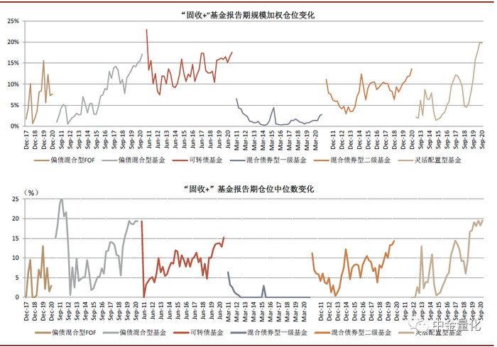 “固收+”基金整体仓位中枢不超过20%,2015年之后仓位水平进入上升通道。从历史仓位来看,除了量化对冲基金外,“固收+”基金整体股票仓位基本不超过20%,2015年之后,随着股票市场底部回升,股票的投资性价比增加,其对于股票资产的配置比例亦有所提升。不同类别“固收+”基金仓位中枢也呈阶梯状,股票仓位从高到低依次为:可转债基金、灵活配置基金、偏债混合基金、二级债基、偏债混合FOF、一级债基。