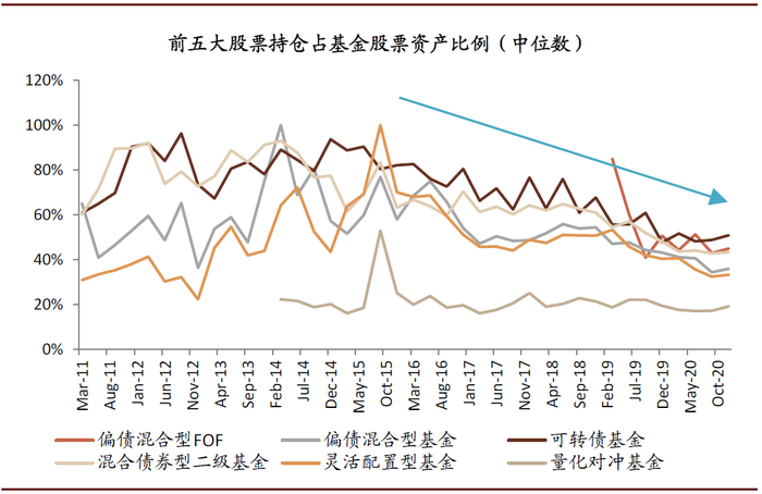 持股集中度:“固收+”基金由于本身仓位不高,投资股票资产规模有限,一般组合中股票数量不多,相较于权益基金而言,持股集中度较高,但自2018年以来市场风格切换,“固收+”产品股票持仓集中度持续下降,持股数量稳步上升;除了量化对冲基金外,其他基金报告期持有股票数量中枢基本在20~40只;量化对冲基金多采用量化策略选股模型,利用股指期货进行对冲来剥离系统性风险,因此多头持仓常与沪深300或上证50接近,组合整体持股数量常超过100只。