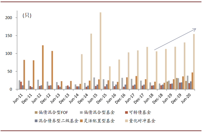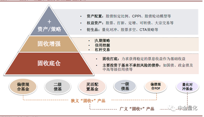 从产品类型来看:“固收+”产品主要分布在一级债基、二级债基、偏债混合型基金、灵活配置型基金(权益仓位较低的)及偏债混合型FOF中,这些是典型的以固定收益类资产为主要投资标的,辅以少量权益属性资产的基金,可称为狭义“固收+”产品。而结合风险收益特征的定义,量化对冲基金也可纳入其中,但由于底层资产并不是债券资产,因此可称为广义“固收+”产品。“固收+”虽然不是一个新概念,却在稳健收益特征的产品发展道路上具有里程碑的意义。