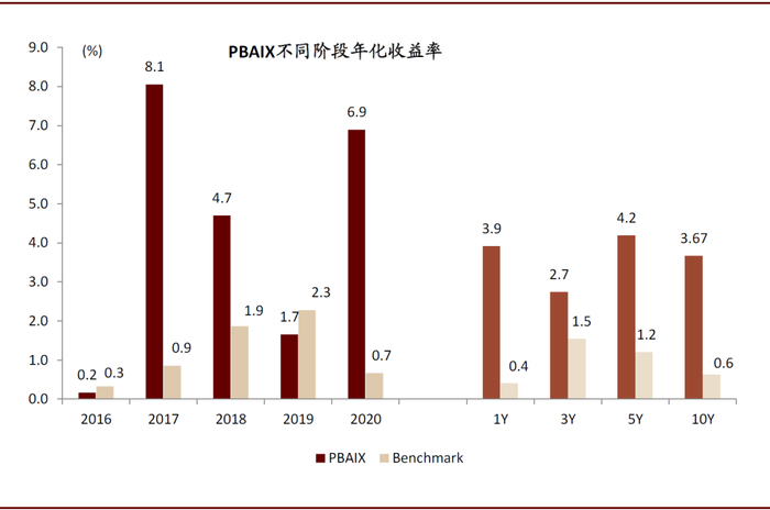 我们以波动率控制基金(BlackRock Tactical Opportunities Fund-Institutional, PBAIX)为例,截至2021年3月底,该基金管理规模达13.92亿美元。从投资策略来看,PBAIX采用全球相对价值策略,寻求与市场相关性更低的增长;同时,结合灵活的战术资产配置策略实现稳定的收益增长;此外,重视组合的下行风险管理,避免在极端市场环境下发生大幅回撤。从业绩表现来看:与BIMBX类似,该基金同样以ICE美国银行3个月国库券指数为业绩比较基准,自2016年以来在每个自然年度均获得正收益,但2016年和2019年均略微跑输基准指数。值得关注的是,在标普500指数下跌了6.25%的2018年,PBAIX仍逆势获得了4.7%的绝对收益。