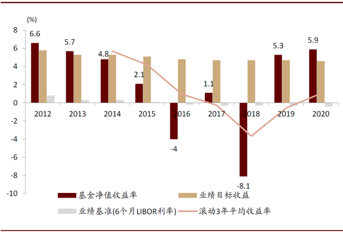 • 投资目标:三年滚动期内的收益水平达到一定现金收益(6个月Libor利率+5%)。