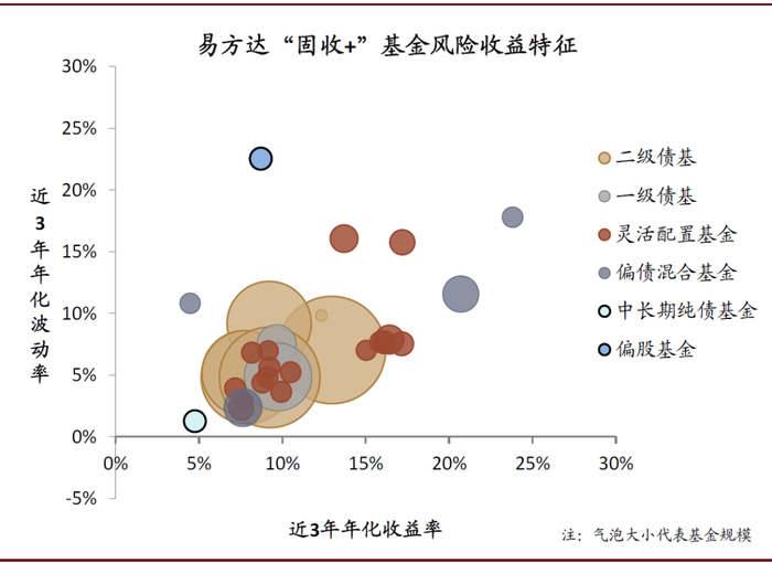 • 产品风险收益特征:从目前成立时间超过三年的产品风险特征来看,招商基金的“固收+”基金主要集中在年化收益10%以内,年化波动率10%以内的中低风险产品中。