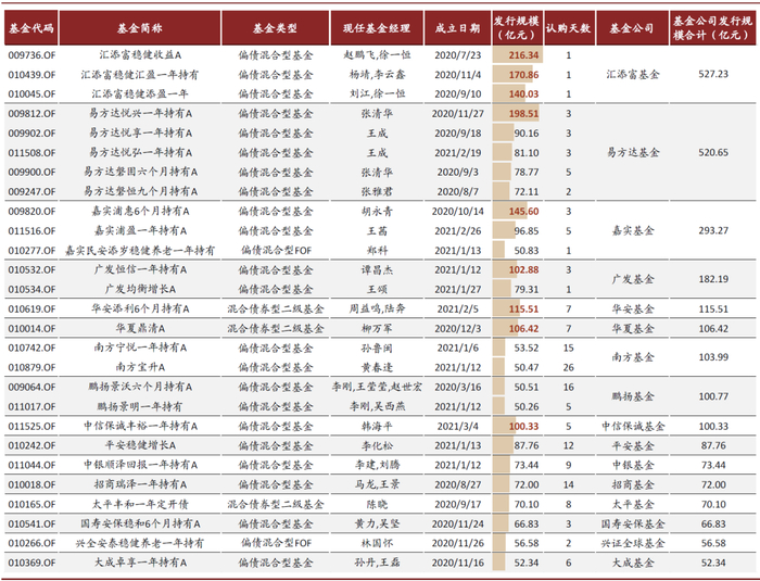 • 偏债混合FOF普遍设置持有期,量化对冲基金多为定期开放:偏债混合FOF和偏债混合基金是设置持有期“固收+”产品的主力,而定期开放的产品主要集中于量化对冲基金和偏债混合基金。