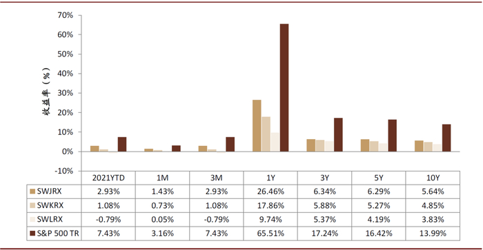 资料来源:Charles Schwab,中金公司研究部,注:数据截至2021.03.31,1/3/5/10年收益使用平均年度收益,其他均使用累积收益率