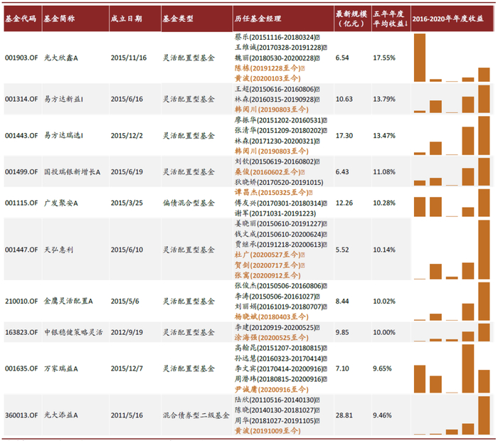 图表:2016-2020年连续五年获得正收益的“固收+”基金(五年平均收益前十)