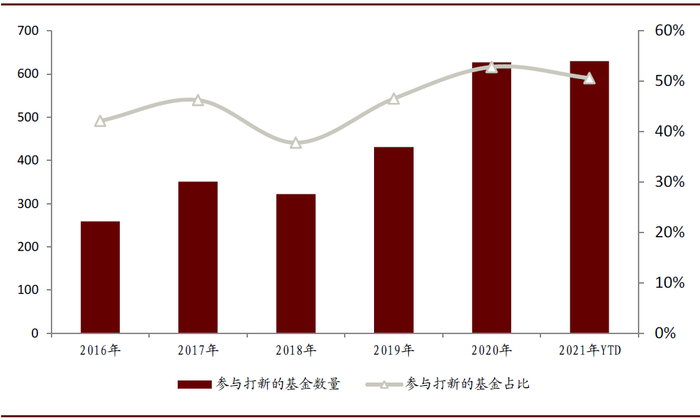 • 设置持有期的产品越来越多:截至2021年2月底,存量产品中累计有189个产品设置持有期,占比达到14%;新发产品中,设置持有期的基金数量占比从2018年的2.2%直线提升到了57%。