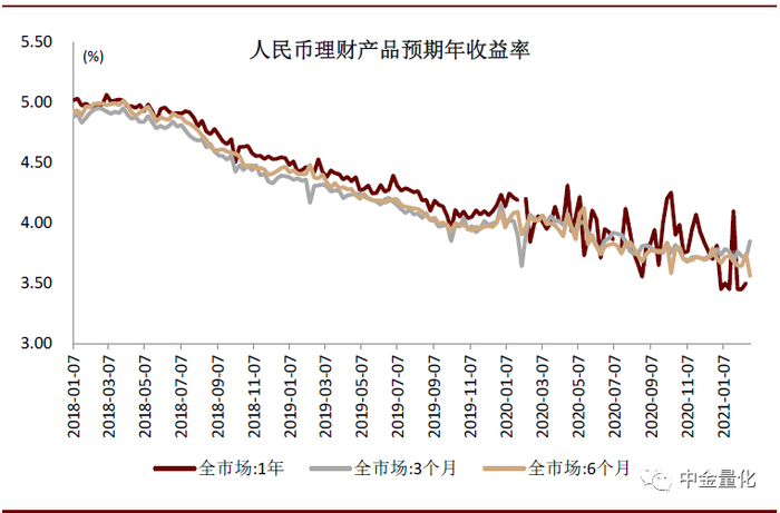 资管新规打破刚性兑付,银行理财逐步实现净值化转型,市场利率下行趋势下,银行理财预期收益持续收缩,预期收益纷纷跌破4%。此外,在互联网平台销量巨大的货币基金,自2018年以来收益中枢亦持续下行,货币基金收益也一路下滑,其中,规模最大的天弘余额宝7日年化收益率也曾跌至2%以下。