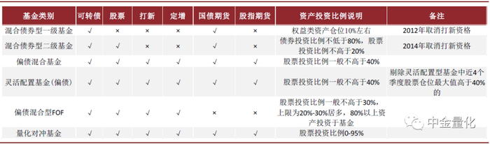 ►在加资产层面,不同类别的基金适用性略有差异。总体上,“固收+”产品是在固定收益资产的基础上,根据产品的投资范围可选择加股票、可转债、股指期货、国债期货、打新、定增等,在适当增加风险资产的基础上,寻求组合整体的收益增强。