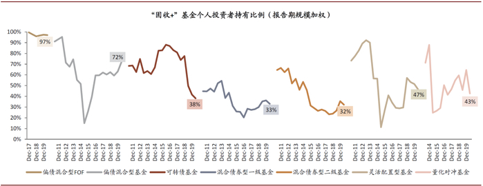 “固收+”产品以绝对收益为目标,追求长期稳健回报。1)投资策略:本质上也是一种“核心-卫星”策略,呈现出“固收+股票”、“固收+打新”、“固收+衍生品”、“固收+转债”等多资产及多策略搭配。2)风险收益特征:风险可控,收益适中,长期收益稳健,属于目前公募基金频谱中较为缺乏的中低风险、中低收益产品。3)运作模式:与银行理财产品类似,越来越多“固收+”基金采用持有期模式。4)资产配置特征:债券资产侧重金融债和企业债投资,股票持仓较为集中,重视长期价值投资。5)投资者结构:机构仍为主要投资群体,中低风险特征产品个人持有比例上升。6)基金经理配置:偏债混合型与灵活配置型的“固收+”产品多基金经理占比较高,基金经理背景多元化,具体情况与各家公司内部组织架构相关。