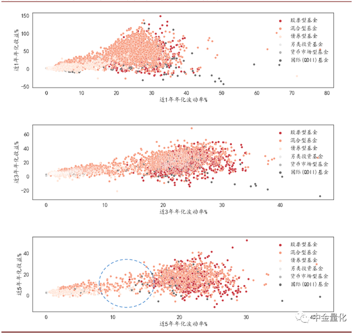 图表: 公募基金近1年/ 近3年/ 近5年年化收益率与年化波动率分布
