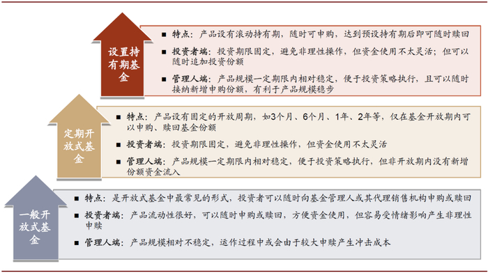 持有期模式一定程度兼顾了产品流动性与投资者非理性赎回。基金的运作模式一般分为开放式和封闭式,而在开放式中又可分为一般开放式、定期开放式和持有期模式基金。一般开放式是目前公募基金普遍采用的方式,即每日可申赎,流动性很好;定期开放式是指产品具有一定的封闭期,在封闭期内不可申购赎回,与银行理财的特征较为相似;持有期模式基金是FOF产品面世之后逐渐兴起的一类运作方式,即产品随时可申购,但申购后需要持有一定的期限,方可赎回。
