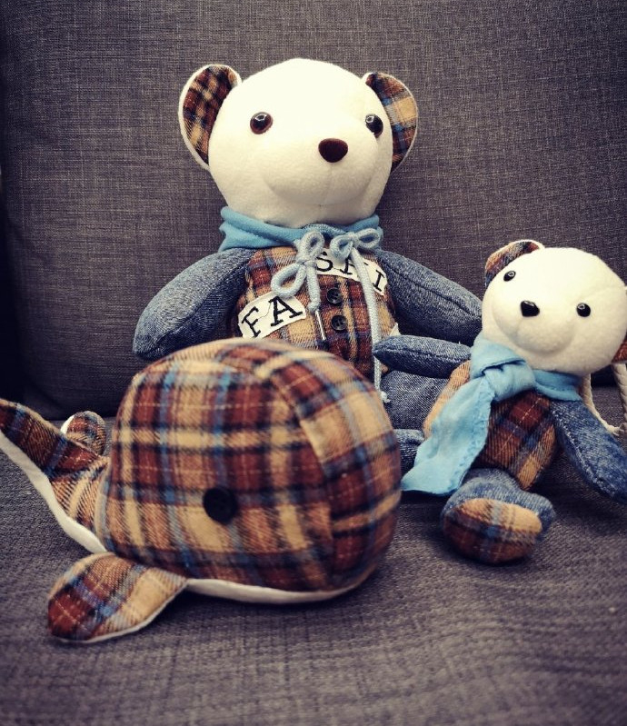 去年夏天,戴畋偶然间得到了布偶小鲸鱼的图纸,从那时起,如果布料剩余,她会再做一只小鲸鱼赠送委托人。从事程序员工作的戴畋下班后先要带娃,制作思念熊往往是在夜里,有时为了赶工期,她不得不熬夜,加入联盟以来,戴畋做了26只思念熊。