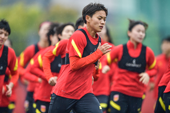 4月11日,中国女足在苏州集训备战奥运附加赛,前锋王霜领跑。IC 图