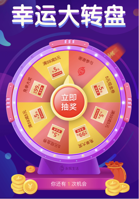 永辉周二会员日当天,会员登陆活动页面,即可获赠1次抽奖资格,最高得99元免单券。每完成一笔38元及以上订单,可再获1次抽奖资格。活动当日每位用户最多可抽奖5次。