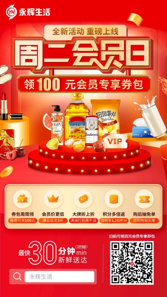 据悉,永辉周二会员日首批登陆城市为福州、成都、重庆,之后将陆续在其他城市上线。