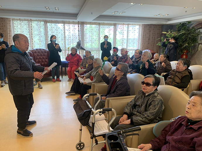 4月13日,为庆祝杨福院喜提金奖,20多老人合唱了《打靶归来》和《茉莉花》,有人负责伴奏有人负责指挥。89岁的徐爷爷摇晃着手中的小花,兴致盎然,他说入住的三年时间,是他晚年生活质量最佳的时候。