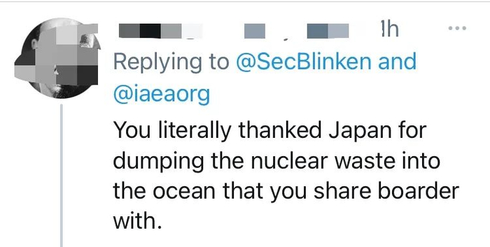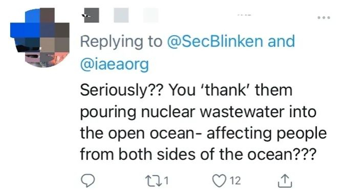 “国务卿先生,这可是往太平洋里倾倒124万吨没有完全处理(科学上也不可能)的核废水,影响全人类,这不比和中国对抗事大吗?有些事情比钱重要,给后代留一个干净的海洋就是其中之一。”