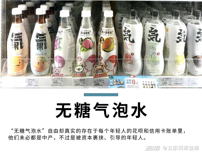 车厘子自由、牛油果自由……或许还只存在于中产家庭的餐桌问题上,但"无糖气泡水"自由却真实的存在于每个年轻人的花呗和信用卡账单里,他们未必都是中产,不过是被资本裹挟、引导的年轻人。