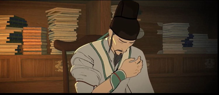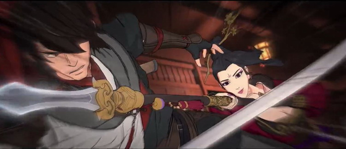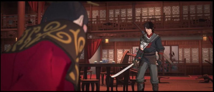 引来如此好评的,无疑是《枕刀歌》里的“武戏”。这部古装动画片的主线其实相当简单。十三年前,工部何侍郎全家在西北边疆的一间客栈遇害,只有幼子何方知一人幸免于难。幼年丧父的何方知流落到蜀中练就一身绝技之后,终于踏上了为父复仇之路。从西北边塞,到山东临清州的运河之畔,再到浙江的翠峰山与南直隶的锦溪,何方知凭借手中的一把剑(“江海阔”),追索仇人,简而言之,就是一路打将过去。在好几集里,武打镜头居然可以占去超过80%的镜头。