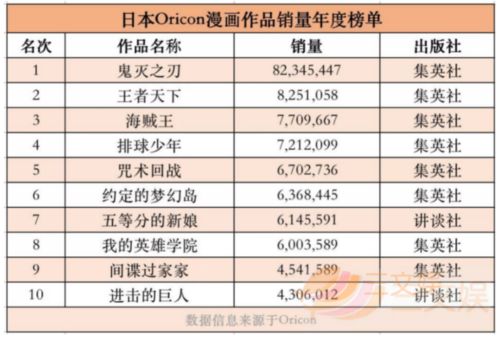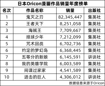 最终,Oricon2020年榜中,《鬼灭之刃》以惊人的8234万年销量位居第一,是第二名《王者天下》的十倍,仅统计年榜前十的总销量,《鬼灭之刃》就占到58%。同时,《鬼灭之刃》占比集英社全年销量53%,一部漫画几乎养活一个出版社。