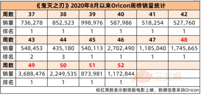 2020年1月~8月的销量统计中,《鬼灭之刃》以5376万排在第一,当下半年动画的热度开始褪去,销量一度疲软跌下百万。2020年10月16日上映的剧场版《鬼灭之刃 无限列车篇》,又为漫画销量添了一把火。从上映前期宣传到上映后,漫画销量明显提升,甚至在电影上映的黄金初期周销量达到368万。