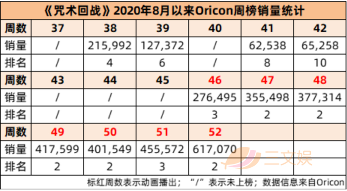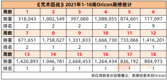 《咒术回战》虽然有粉丝基础,但仍称不上大火,在动画播出前,除了新卷发售,《咒术回战》的身影并不常出现在销量榜前十,销量跟《鬼灭之刃》比更是小巫见大巫。但是10月3日动画一经播出,反哺效应便立刻出现。从周销量不到十万,到二十、三十、四十、六十万的突破,在MAPPA经费疯狂燃烧的制作加成下,《咒术回战》一路走高,成为仅次于《鬼灭之刃》的第二热门选手。