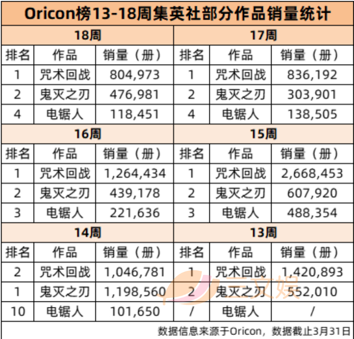 随着《鬼灭之刃》剧场版上映到后期以及《咒术回战》动画剧情的不断推入,《咒术回战》开始超过《鬼灭之刃》排位第一,大部分周数都突破了百万销量,在15周达到最高峰266万,据了解,偶尔数据不理想也是由于缺、断货严重。集英社于2021年3月31日宣布,《咒术回战》漫画总发行量已突破4000万册,卷均突破250万。