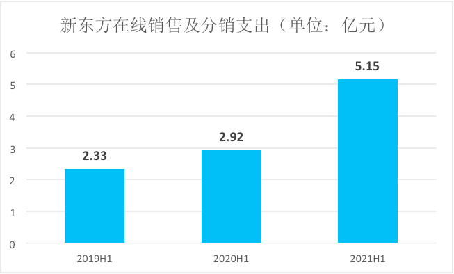 包含K12业务在内,新东方在线的“财务模型”中最大的支出在于营销销售成本,2021财年H1新东方在线销售及分销支出5.15亿元,较去年同期2.92亿元,增长了76%。