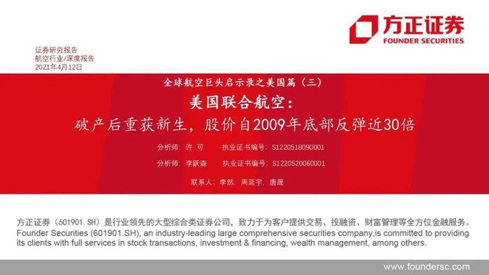 本文来自方正证券研究所于2021年4月12日发布的报告《全球航空巨头启示录美国篇之美国联合航空:破产后重获新生,股价自2009年底部反弹近30倍》,欲了解具体内容,请阅读报告原文。许可S1220518090001,李跃森 S1220520060001。