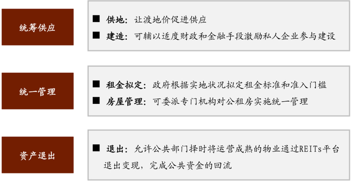 我们认为用REITs构建租赁住房供给体系存在一些框架要点。首先,我们还是澄清私人部门以完全商业化条件自主开发的一些中高端长租公寓产品不在我们这里讨论范围(该类产品的适用面可能也相对局限),其投资退出方式选择可以自主灵活。我们在此讨论的更多是公共部门希望大面积推行的带有一定公共性质的租赁住房建设开发,如何结合REITs来更有效的为公共部门投融资服务。从前端供应、中端运营管理、后端退出,我们认为有以下原则性事项: