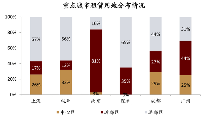 ► 项目区位。随着租赁用地供应数量的增加,中心区租赁用地供应占比明显下滑,占比不足3成。
