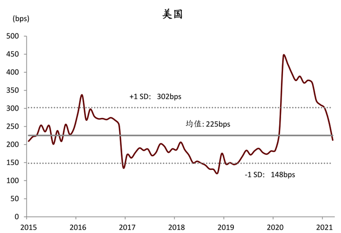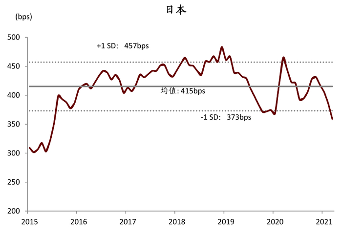图表: 美国和日本公寓REITs股息收益率对十年国债的溢价