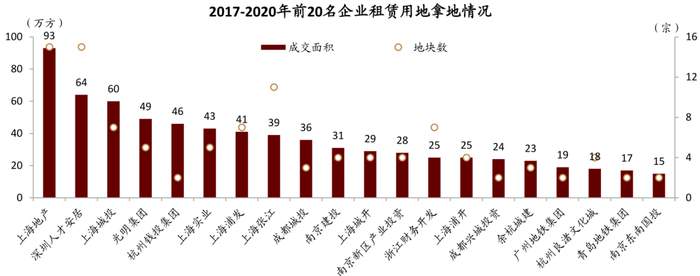 ► 购地企业。由于租赁用地多采取定向出让,所以拿地主体主要是各地方国家队企业,其中前20家企业共计收购了近40%租赁用地,私人部门参与相对受限。